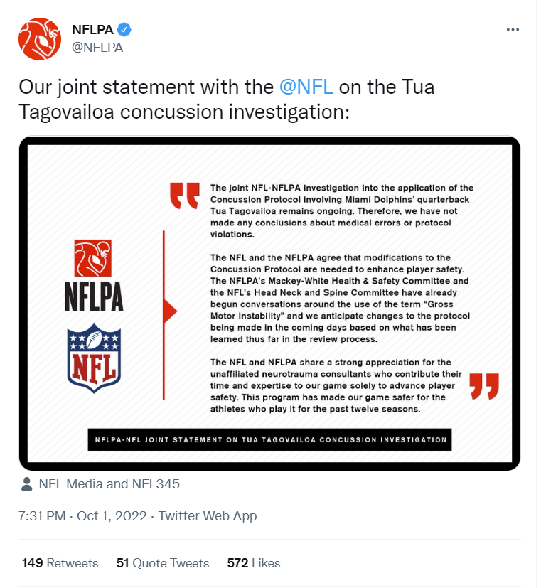Despite this reporting, the NFLPA also released a joint statement with the NFL that reads, “The joint NFL-NFLPA investigation into the application of the Concussion Protocol involving Miami Dolphins’ quarterback Tua Tagovailoa remains ongoing. Therefore, we have not made any conclusions about medical errors or protocol violations.”