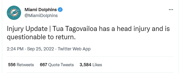 Following the game Dolphins head coach Mike McDaniel revealed it wasn’t a head injury, but a back injury. He explained, “Now, Tua, he went out with a lower back, and I hadn’t had that rep with him yet.”