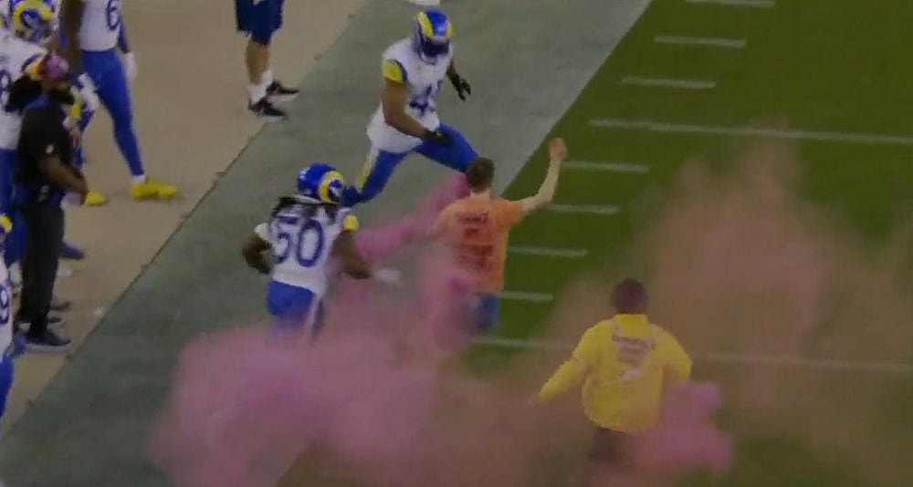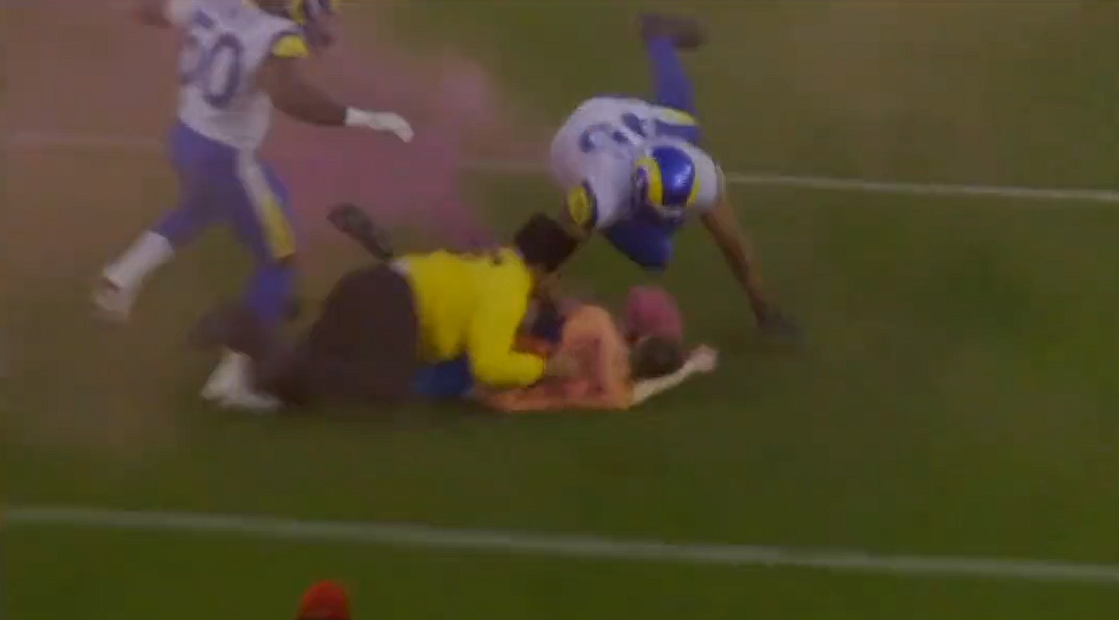 Alex was able to flee the field’s security dashing across the field and making his way over to the Rams’ bench. However, when he got to the bench, McKinley began pursuing him and led him right into the oncoming tackle of Bobby Wagner.