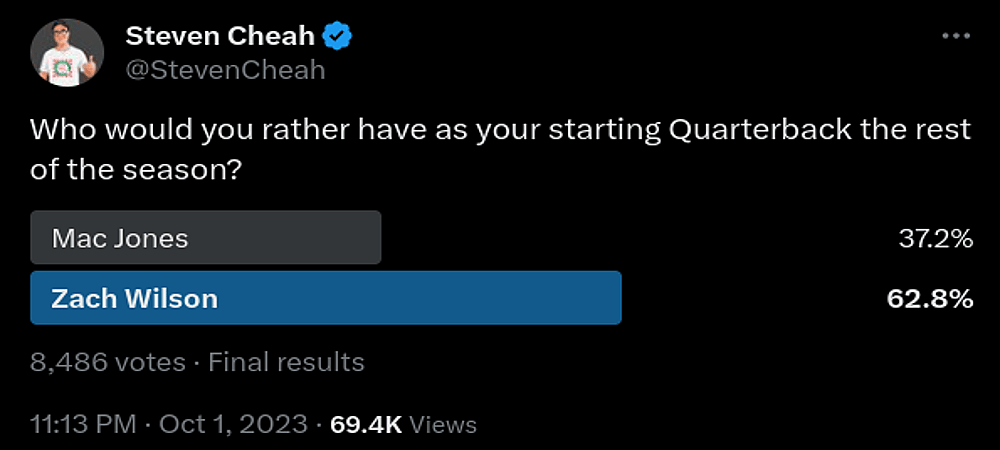 On October 1, on the social media platform x, Chaeh posted the results of a poll that featured 8486 participants. In it, an overwhelming number of NFL watchers picked Zach Wilson over the Patriots’ beleaguered signal caller.