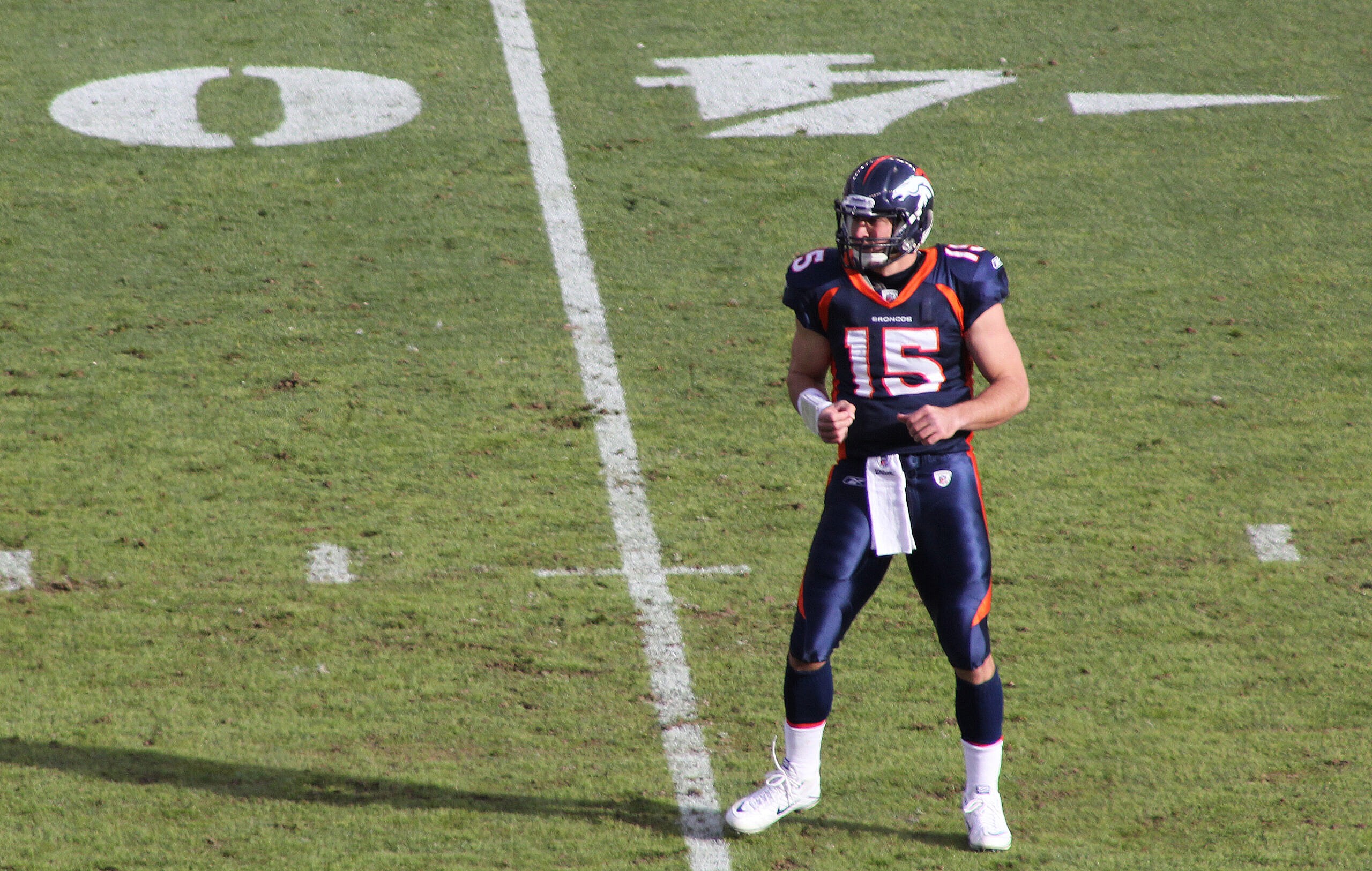Tim Tebow watches the outcome of one of his plays. This was at the Broncos / Texans game in Denver on December 26, 2010. Photo Credit: Jeffrey Beall from Colorado, USA, CC BY-SA 2.0 <https://creativecommons.org/licenses/by-sa/2.0>, via Wikimedia Commons