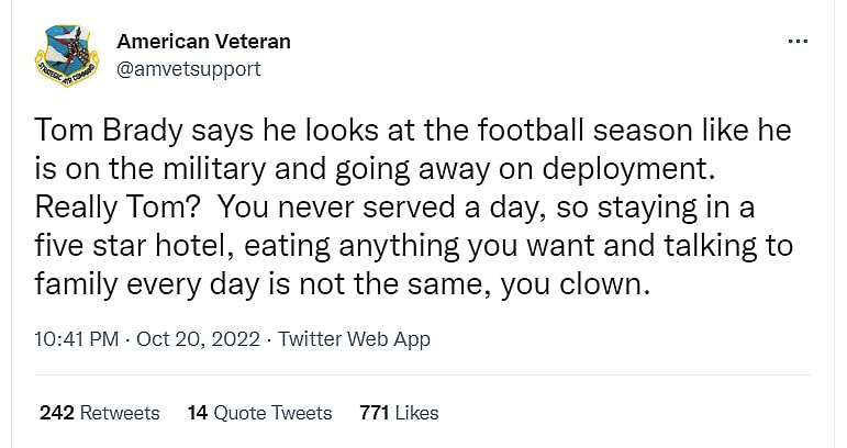 AmVetSupport wrote, “Tom Brady says he looks at the football season like he is on the military and going away on deployment. Really Tom? You never served a day, so staying in a five star hotel, eating anything you want and talking to family every day is not the same, you clown.”