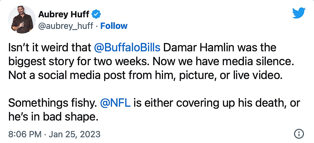 “Isn’t it weird that @BuffaloBills Damar Hamlin was the biggest story for two weeks,” Huff posted to Twitter on Wednesday. Now we have media silence. Not a social media post from him, picture, or live video.