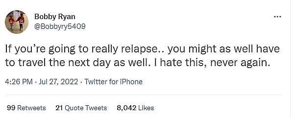 A couple of hours later he tweeted, “If you’re going to really relapse.. you might as well have to travel the next day as well. I hate this, never again.”