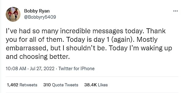 Reacting to his recent arrest on Twitter, Ryan wrote, “I’ve had so many incredible messages today. Thank you for all of them. Today is day 1 (again). Mostly embarrassed, but I shouldn’t be. Today I’m waking up and choosing better.”