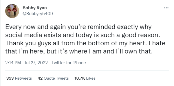 He followed that up writing, “Every now and again you’re reminded exactly why social media exists and today is such a good reason. Thank you guys all from the bottom of my heart. I hate that I’m here, but it’s where I am and I’ll own that.”