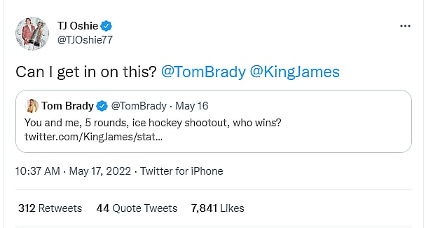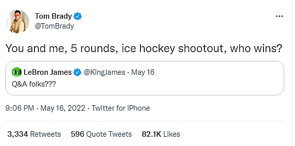 In response to a Q&A hosted by James, Brady tweeted: “You and me, 5 rounds, ice hockey shootout, who wins?”