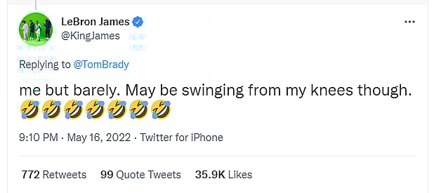 James himself was entertained by Brady’s wild idea, tweeting in response: “me but barely. May be swinging from my knees though. 🤣🤣🤣🤣🤣🤣🤣.”