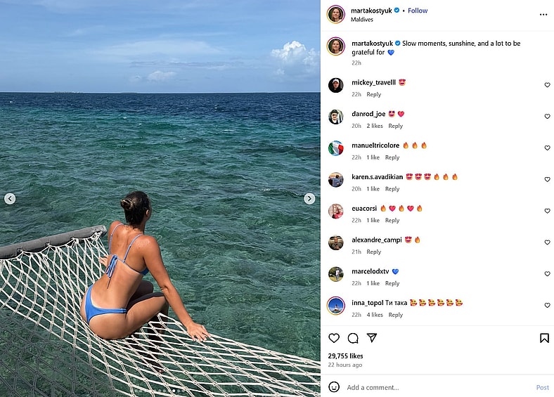 Not to be outdone, Kostyuk also took to Instagram to post her own fun beach-loving bikini snaps from the Maldives.