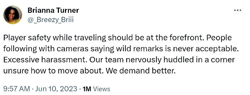 “Player safety while traveling should be at the forefront,” tweeted Mercury forward Brianna Turner. “People following with cameras saying wild remarks is never acceptable. Excessive harassment. Our team nervously huddled in a corner unsure how to move about. We demand better.”